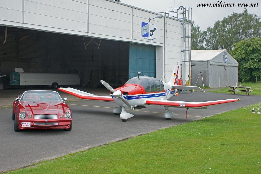 Trotzdem liessen sich bestimmt 30 US-Cars und etwa 10 Fahrzeuge aus europäischer Produktion nicht abschrecken. Und sogar ein kleiner Kunstflugdoppeldecker kam um am Treffen teilzunehmen. Nach einer kurzen Loopingeinlage vor der Landung zeigte sich der Besitzer sehr freundlich und bot uns an eine kleine Fotosession am Hangar durchzuführen, was wir natürlich sofort wahrgenommen haben. Wirklich prima!